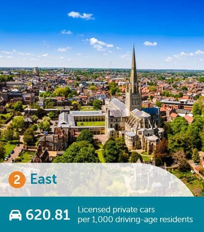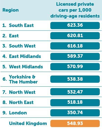 However, when also looking at regions of England, the South East has the highest rate of car ownership at 623.36 private cars per 1,000 potential drivers. This is followed by the East of England with 620.81 cars per 1,000 people and the South West with a rate of 616.18.