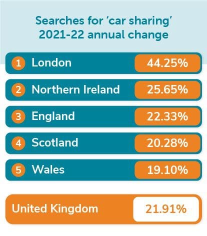 Searches for ‘car sharing’ in the UK increased considerably in 2022, with a 21.91% rise compared to the previous year. This indicates that an increasing number of people have been looking for car-sharing services and information since the beginning of the cost of living crisis.