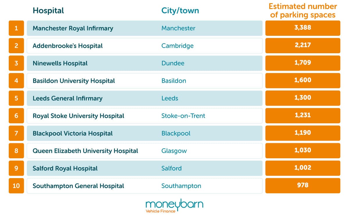 With 3,388 parking spaces, Manchester Royal Infirmary tops the list. Located in Manchester, this hospital is one of the largest in the UK, serving a wide area and with a high volume of patients, staff, and visitors, which is why it needs such a large parking facility.