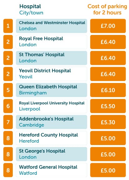 We looked at 50 major hospitals in the UK and calculated the cost of 2 hours of parking on a weekday (10:00am to 12:00pm on a Monday), not considering any potential discounts. We included only hospitals that offered public parking for at least 2 hours throughout the day.