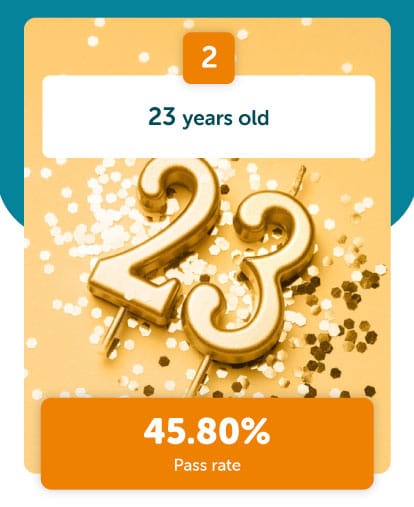 The practical pass rate for both 23-year-olds and 25-year-olds is 45.8%, the joint second-highest of any age. Despite having the same pass rate, these two age groups differ quite a lot in the number of people taking tests, totalling 29,331 and 22,626, respectively.Â