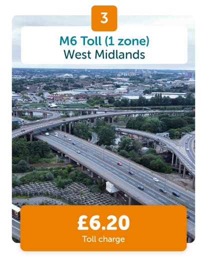 1-3. M6 Toll, toll charge: £6.20 to £9.70