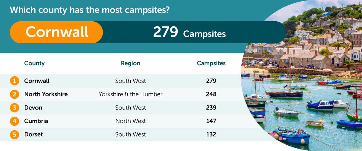 Cornwall has the most campsites of any county in the UK, with 279. It also has the best weather, with 1,745 annual sunshine hours.